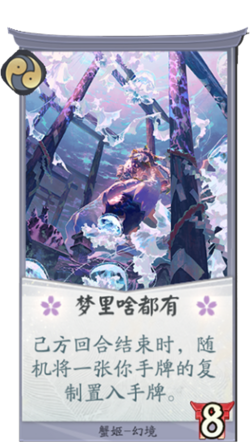 蟹姬在对局中具有较高的成长上限,卡牌在被使用后可以获得瞬发或相应的增益效果。在对局中不断地使用蟹姬的同名卡牌,可以使蟹姬获得更可观的增益效果。