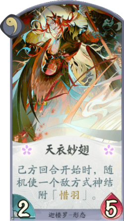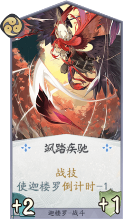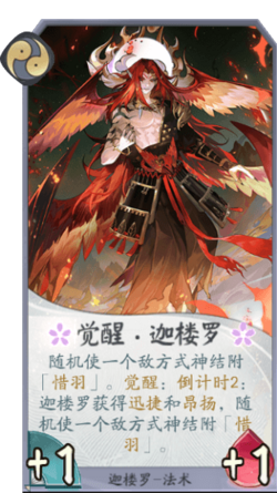 迦楼罗能依靠自身「倒计时」能力获得「迅捷」和「昂扬」,且能通过具有「战技」效果专属牌强化自身的出击效果,还可以对敌方式神结附灵咒「惜羽」并在出击时对其造成伤害。