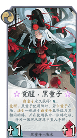 黑童子的卡牌多与白童子有关,在使用黑童子的牌时,若白童子在场,就可以「连引」一张属于白童子且等级与其相同的牌进行选择使用。若黑童子已觉醒,在「连引使用」卡牌后,能将未选择使用的卡牌置入手牌。