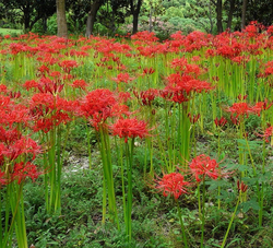 在日本,红花石蒜有“彼岸花”和“曼珠沙华”两个别称。“彼岸花”这一名称是传说该花生于冥河的彼岸而得名。“曼珠沙华”,源自梵语“Majusaka”[1]。
