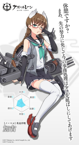 | 简介 | 古鹰型重巡洋舰二号舰,加古,算是第一艘本国产重巡吧,虽然在第一次所罗门海战出了力,不过最后不小心被潜艇击沉了,这也是没办法的事……性格?那只是对你才使用的态度哦。总之,重巡的好处,就睁大你的双眼好好体会吧 | |