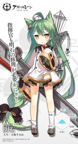| 好感度-爱 | 有明石在,指挥官可以永远不用担心补给的问题喵!指挥官只要向着自己的目标前进就好了喵~明石作为最亲密的伙伴,会全力给与指挥官支持的喵! |