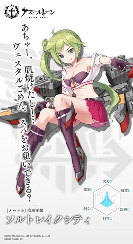 | 简介 | 彭萨科拉级重巡洋舰二号舰“盐城湖”号,嗯,毫无疑问是重巡洋舰哦。虽然因为条约的关系装甲(衣服)较薄,但火力可没有下降哦。参与了太平洋战争中的诸多战斗,并且成功存活到了最后,所以说装甲(衣服)根本没有大用嘛。科曼多尔?运气也是实力的一部分嘛。不,我才没再狡辩,难道指挥官想让我穿的和拉菲一样多吗? | |