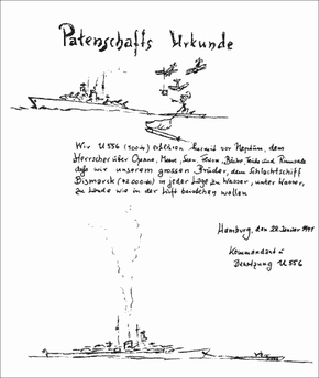 保证书上画著同样出现在U-556舰徽上的骑士珀西瓦尔,一手举著宝剑为俾斯麦抵御空袭,另一手则挡下鱼雷。下方的另一幅图画著U-556拖曳着俾斯麦航行。
