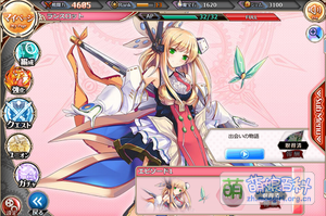 - 最上方的部分从左到右依次是:当前编队的战斗力、御主等级、神姬币神经病(口胡)数量、魔宝石数量和金币数量;再下面的青色条以及赤色条是AP、BP值。