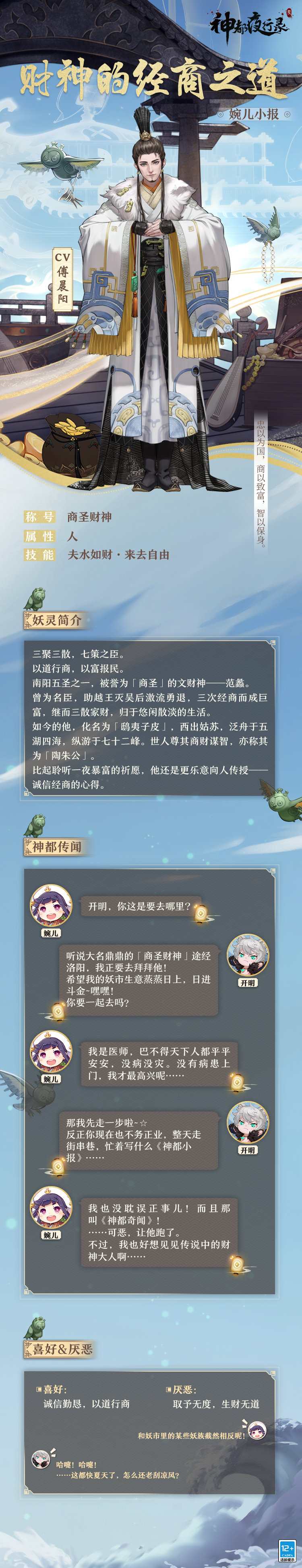 | 妖灵召唤 | 乘舟浮海,离越适齐,吾号——鸱夷子皮。 | |