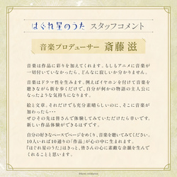 | はぐれ星のうた 全碟作词:Evan Call(第1、13轨) 全碟作曲:Evan Call 全碟编曲:Evan Call 全碟演唱:市川爱(第1、9、13轨演唱、合唱) |