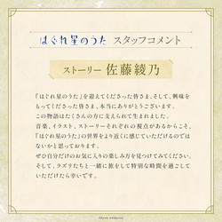 《离群星之歌》(日文:はぐれ星のうた)是由佐藤绫乃编写剧本、山崎诗央里作画的绘本,并有与其配套的由Evan Call担任音乐创作的CD光盘。作品于2023年12月31日的Comic Market103上首发,并于2024年1月8日正式发布。