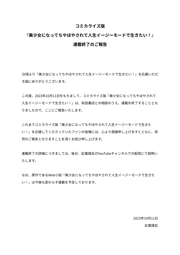 漫画版《想变成美少女被人宠爱,开启人生简单模式!》连载终止的报告