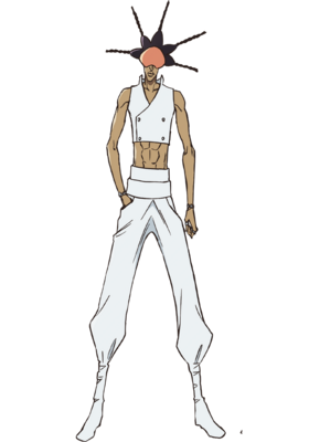 - 身穿白色的灭却师大衣军装,头戴覆盖上半张脸、类似于护目镜的橘色头盔,内穿露出腹部的无袖短上衣,双手戴着白色手镯,五指都带有戒指。