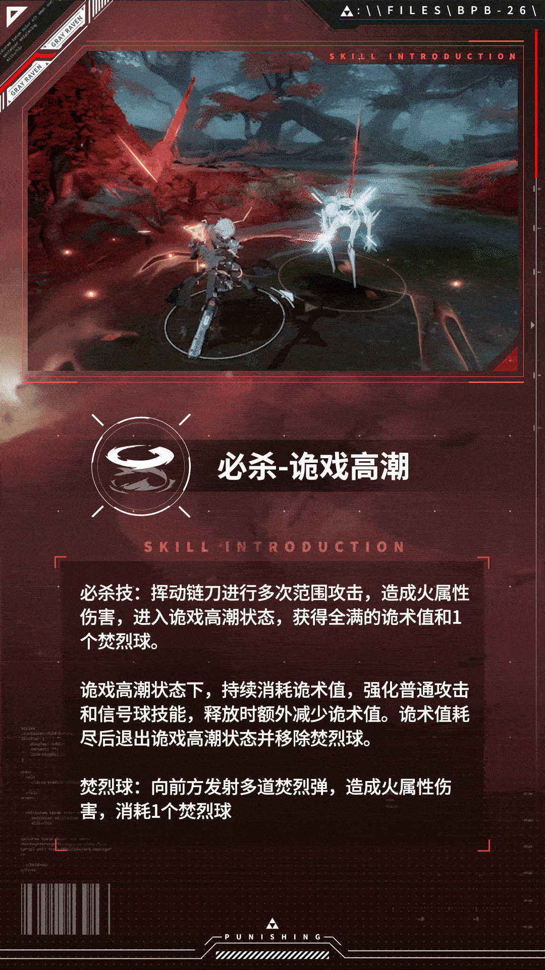 诡戏高潮状态下,火属性伤害增加,信号球技能伤害增加。释放必杀技后,刷新触发超算空间的冷却时间。