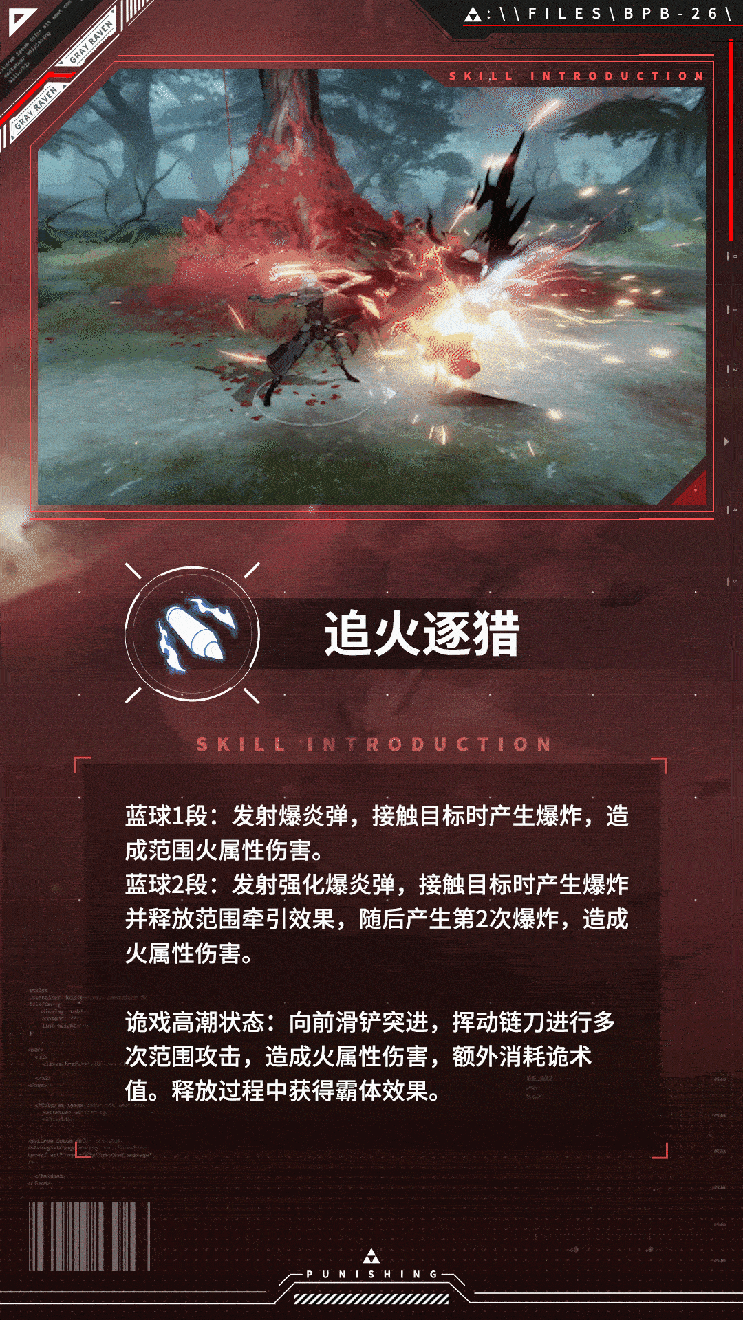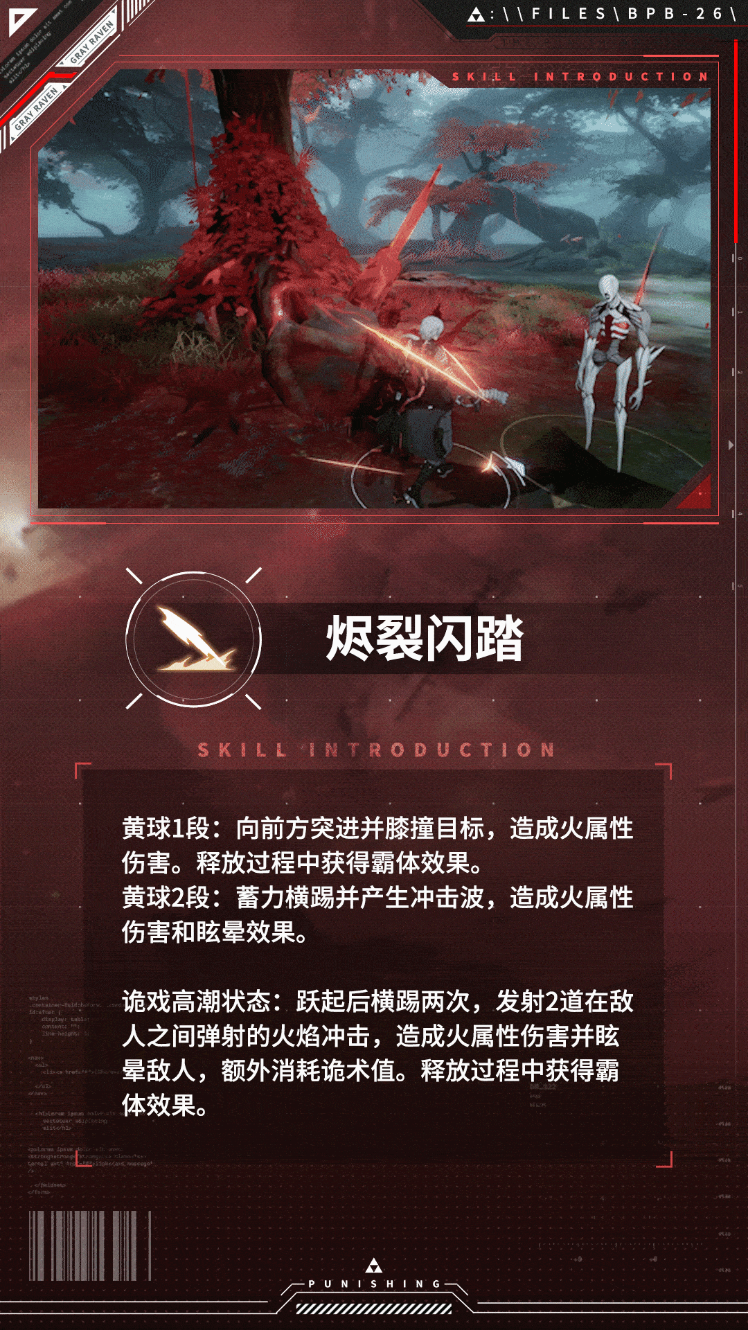 诡戏高潮状态:跃起后横踢两次,发射2道在敌人之间弹射的火焰冲击,造成共1170%的火属性伤害并眩晕敌人,消耗40点诡术值。释放过程中获得霸体效果。