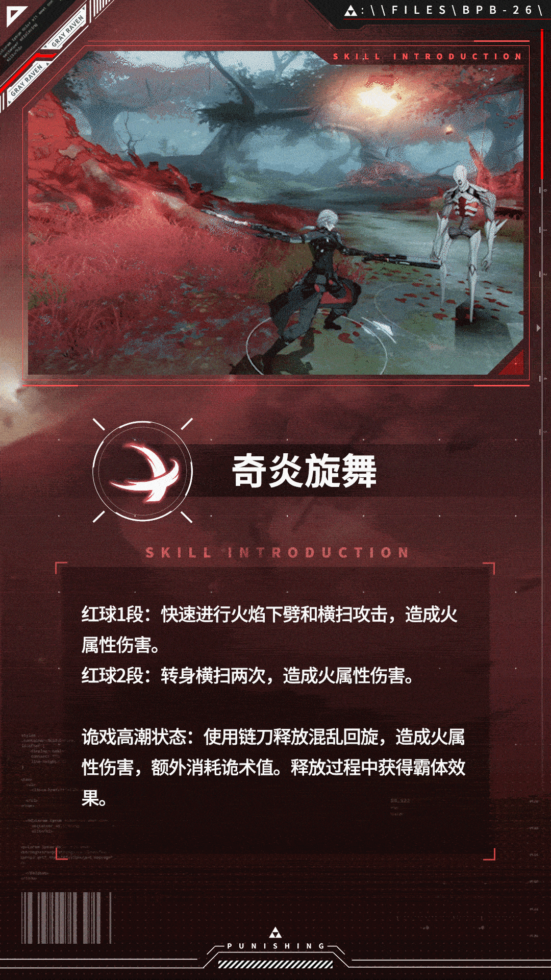 诡戏高潮状态:使用链刀释放混乱回旋,造成共1260%的火属性伤害,消耗40点诡术值。释放过程中获得霸体效果。