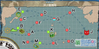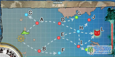 | ※:虽然地图上E和I之间标有航路,但实际上没有走这条路的报告。 据说远古时期有E→I,但田中后来发现这样一次出击最多可以走四个资源点就改掉了。 | ||