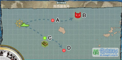 | 起点 | A | 驱逐舰3艘以下去C 轻巡1艘加驱逐舰,固定去A 除此之外只有驱逐和轻巡的编成偏向A的随机? 含有重巡、航巡、航战、轻母的编队固定去C 除此之外随机? |