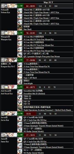 | 乙难度 | 空母栖姬改(乙)、轻母ヌ级改elite(耐久88夜战形态)×2、战舰タ级elite、重巡ネ级elite×2 | 空母栖姬改(乙)、轻母ヌ级改elite(耐久88夜战形态)×2、战舰タ级elite、重巡ネ级改(乙)×2 | |