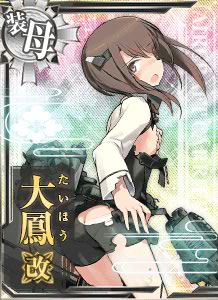 | 图鉴说明 | 航空母艦「大鳳」です。 飛行甲板まで十分な防御を施された最新鋭の正規空母です。 密閉型の格納庫やハリケーン・バウもいい感じでしょ? 装甲甲板もお化粧直ししてみたわ。どう?似合う? 我是航母大凤。 |
