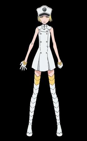 头戴无形帝国军帽,身穿长筒状无袖连衣裙,双手戴着边缘有黄色装饰的白色手套,腿部穿着边缘有黄色装过膝靴,心型匣子内装有圣弓。