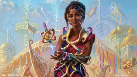 莎希莉是一位同时操控着红蓝两种颜色法术力的鹏洛客。