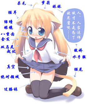 | 性格(单人) | 傲慢(高飞车)、弱气、冒失、傲娇、病娇、天然呆、笨蛋、仆娘(仆少女)、腹黑、温柔、天然萌、傲沉、元气、KY、小恶魔系、中二病等 |