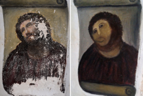 博尔哈教堂的《荆冠耶稣画》,是19世纪画家埃利亚斯•马丁内斯(Elijah Garcia Martinez)的作品。在经历120年的风雨之后,该壁画变得斑驳不已。2012年8月住在附近的老妇人希门尼斯看不惯这个壁画没有人修复,于是自己动手,结果修复后画像成史前人猿模样[1]。