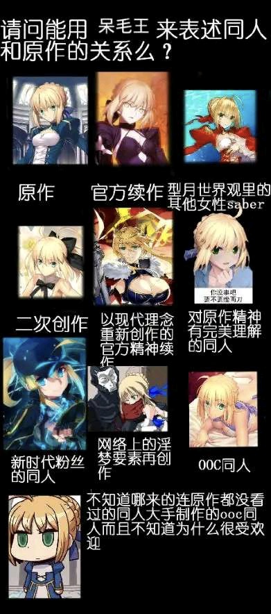 通常分为十个部分:原作、官方续作、型月世界观里的其他女性saber、二次创作、以现代理念重新创作的官方精神续作、对原作精神完美理解的同人、新时代粉丝的同人、网络上的淫梦要素再创作、OOC同人、不知道哪来的连原作都没看过的同人大手制作的OOC同人而且不知道为什么很受欢迎。