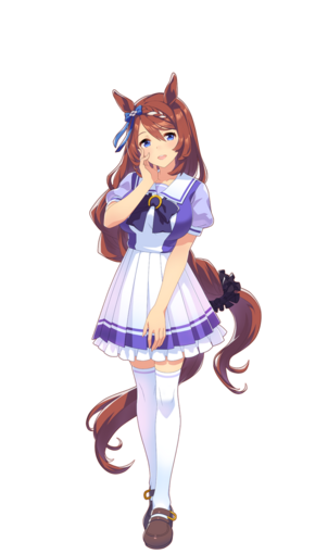 第70话,与醒目飞鹰、稻荷一、特别周、无声铃鹿在夏日集训中进行借物赛跑时,按要求要借来“旗子”,却借来了炒面店的招牌。