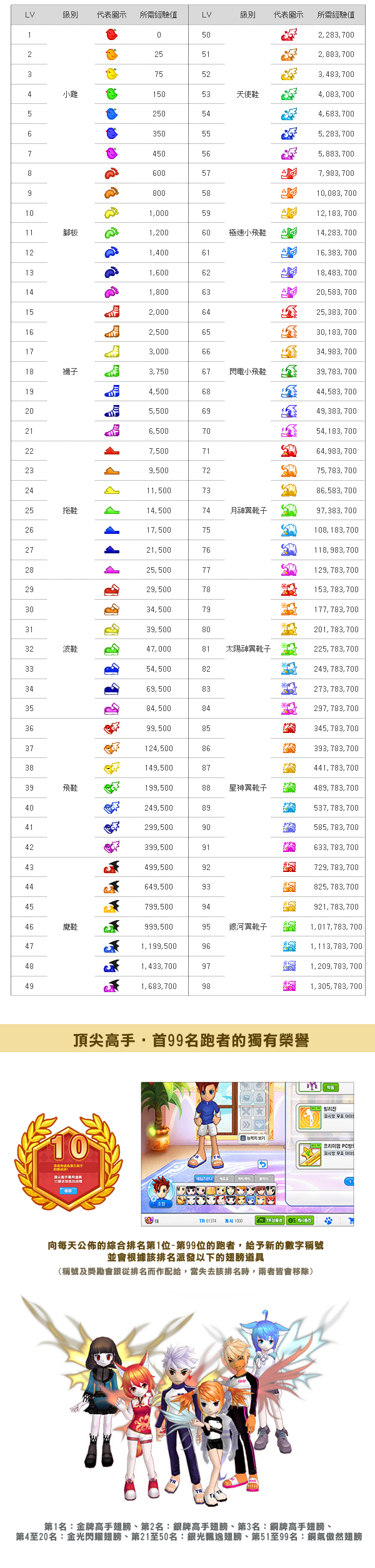| 不同等级所需经验值 |