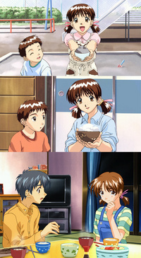 - 《天才宝贝》:小实有一回在幼稚园和一加还有浩子玩过家家时,正好赶上小实因为吃相不好的问题与哥哥拓也争吵,心情不好没有吃饭,把一加送来的“料理”给打翻,弄得一加大哭。
