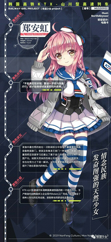 郑安虹是北方铁道萌化部创作的铁道少女世界架空世界观的原创角色,在收录的改编出版物《铁道少女图鉴》中,为韩国铁道公社KTX-山川型电力动车组、SRT型电力动车组的拟人化萌娘。[1]