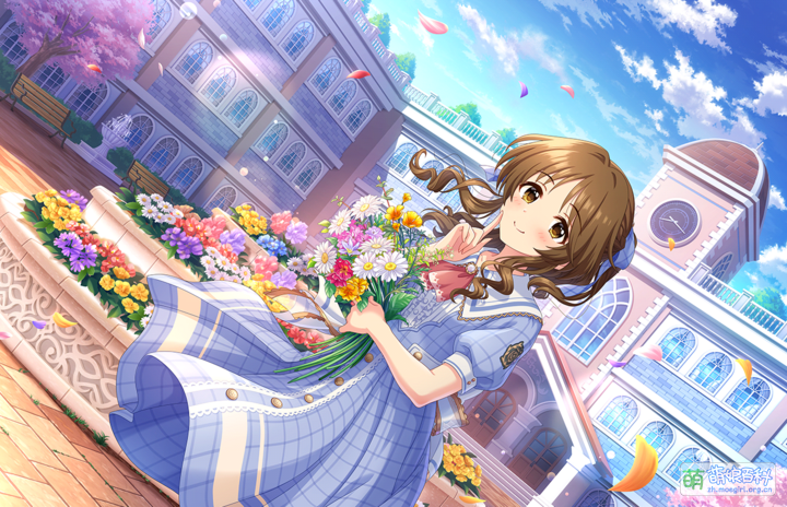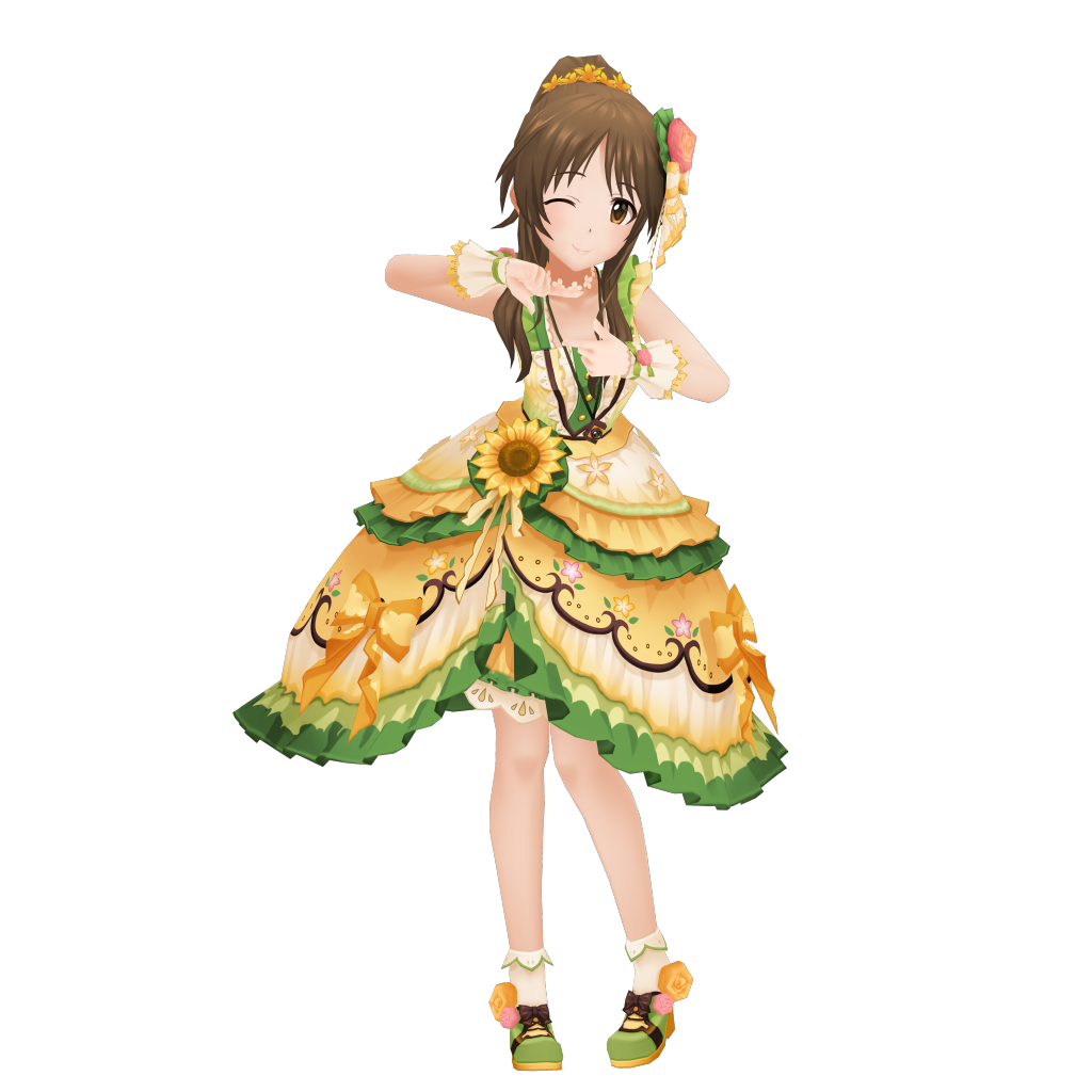 棕色波浪中长发,脑后一个团子状发髻(特训后多为马尾,后来的卡面也有麻花辫之类的造型),头上经常戴着花型发饰。胸围74,比72大点,是偶像中坚实的贫乳派。然而因为腰围60,推定胸围为AAA,算起来比72还平(72腰围55)。