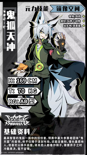 | 凹凸大赛预赛中最大的参赛者团体“鬼天盟”的首领。鬼狐一族号称是全宇宙最智慧的一族,鬼狐天冲作为其中的佼佼者,不仅精于谋划布局,同时也能言善辩,擅长蛊惑他人。喜欢以棋手自居,将其他人都看作是棋子,需要弃子之时冷酷果决、毫不留情。