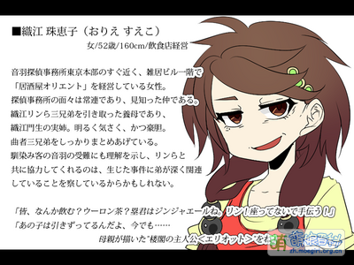 在离音羽侦探事务所东京本部很近的一栋杂居大楼一楼经营着居酒屋「Oriental」的女性。侦探事务所的员工都是她的熟客,彼此都算是老相识。 收养了织江琳三兄弟的养母,也是织江门生的亲姐姐。直率开朗,豪放胆大。对搞定怪人三兄弟颇有心得。 她会对熟悉的客人音羽的受难表示理解,选择与琳等人一同提供协助,或许是因为察觉到了发生的事件与弟弟存在深刻的关联。