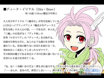 右手手持一把褪色的长剑,带着猫一样的神秘生物。帮助了不清楚现状的音羽,同时也因确信罗泽玛利亚突然出现的异变是作为魔王的亲生哥哥埃加搞的鬼,而寻求音羽一行人的协助。