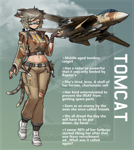 1970年收费入学,现已毕业。是美国海军曾经的主力舰载战斗姬。是北约海航学院中传说级的最强少女。妹妹是F/A-18姬