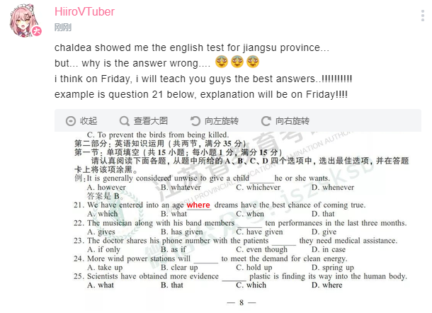 4月22日下播后做了chacha发来的江苏高考英语试卷,并发现了答案有错误,后在置顶评论中解释。
