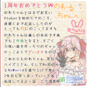 打招呼用语:开播时“こん()のわーるど()(你好NoWorld)”,下播时“おつ()のわーるど()(辛苦了NoWorld)”。