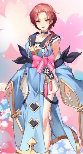 粉发黄瞳,将头发束起侧于胸前,身穿露腋和服,脖子上配有铃铛项链作装饰。只以侧身形象示人,是标准的大家闺秀。