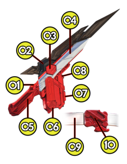 | ①Slashrise Trigger | 斩击升华器的扳机 扣动扳机来进行Shotrise,完成变身 也有作为短剑发动通常攻击和必杀技等作为系统全体发动器的机能 |